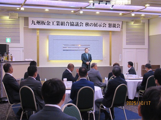 令和7年10月18日(土)サンメッセ鳥栖において、2年後の全板福岡大会に向けて『九州はひとつ』の合言葉を胸に九板協『秋の展示会』が開催されました。当日は曇り空となりましたが、予定通りに午前8時から九板協役員、各県青年部長総勢30名のスタッフと、賛助会、協力商社60名により展示ブース17社のパーテーション、長机椅子の設置と工具、資材サンプル、カタログ等の搬入及び設置をして頂き、一連のセッティングを90分間で全て完了し、9時半よりステージ上での各県理事長あいさつと確認事項を行い10時前には、受付ブースも抽選券、記念品等の準備をし、長崎県板50名を含め九州各県の参加者計230名の組合員を受入れる体制を整えました。