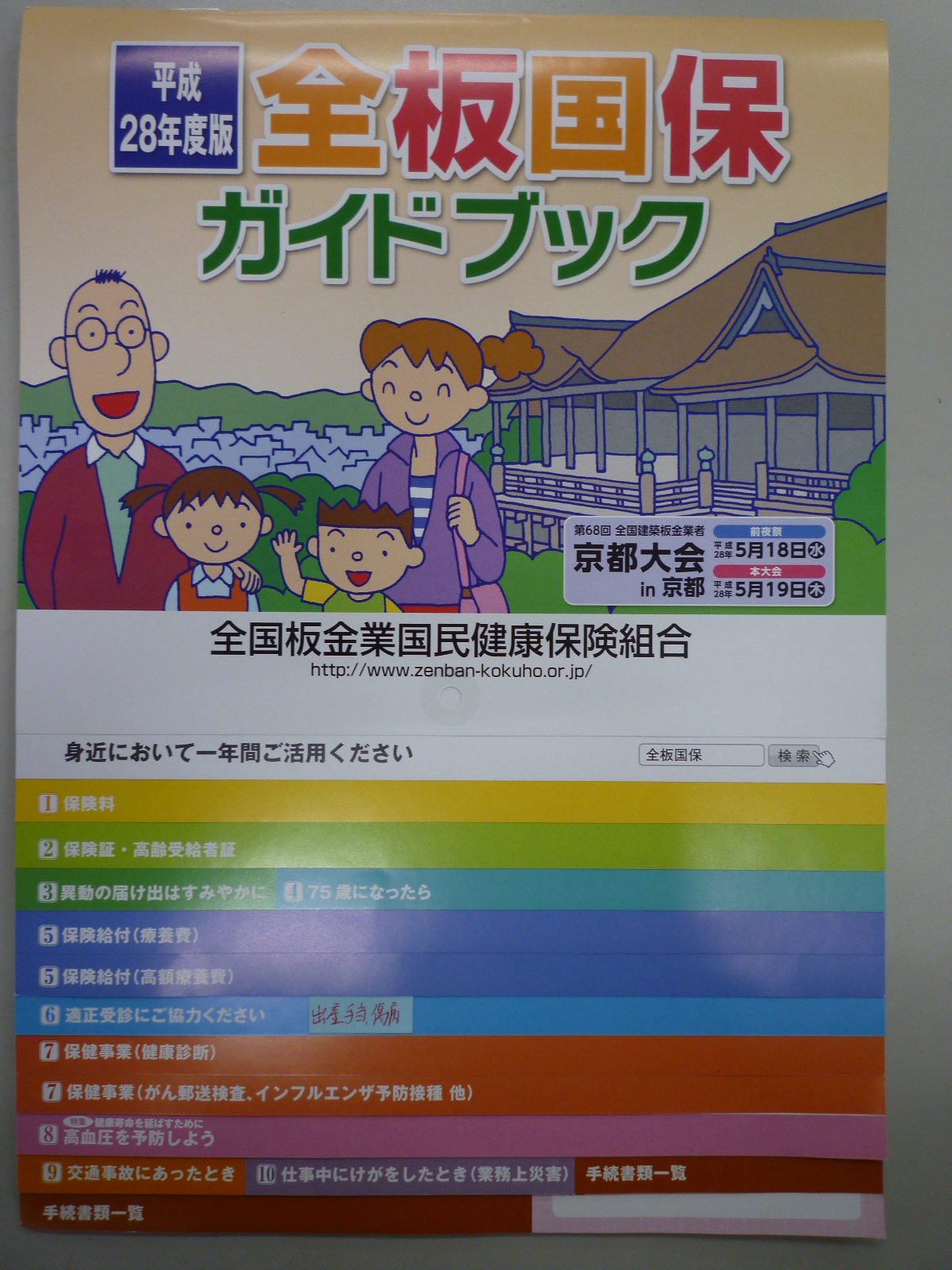 平成28年4月からの保険証と一緒に「全板国保ガイドブック」をお渡ししています。