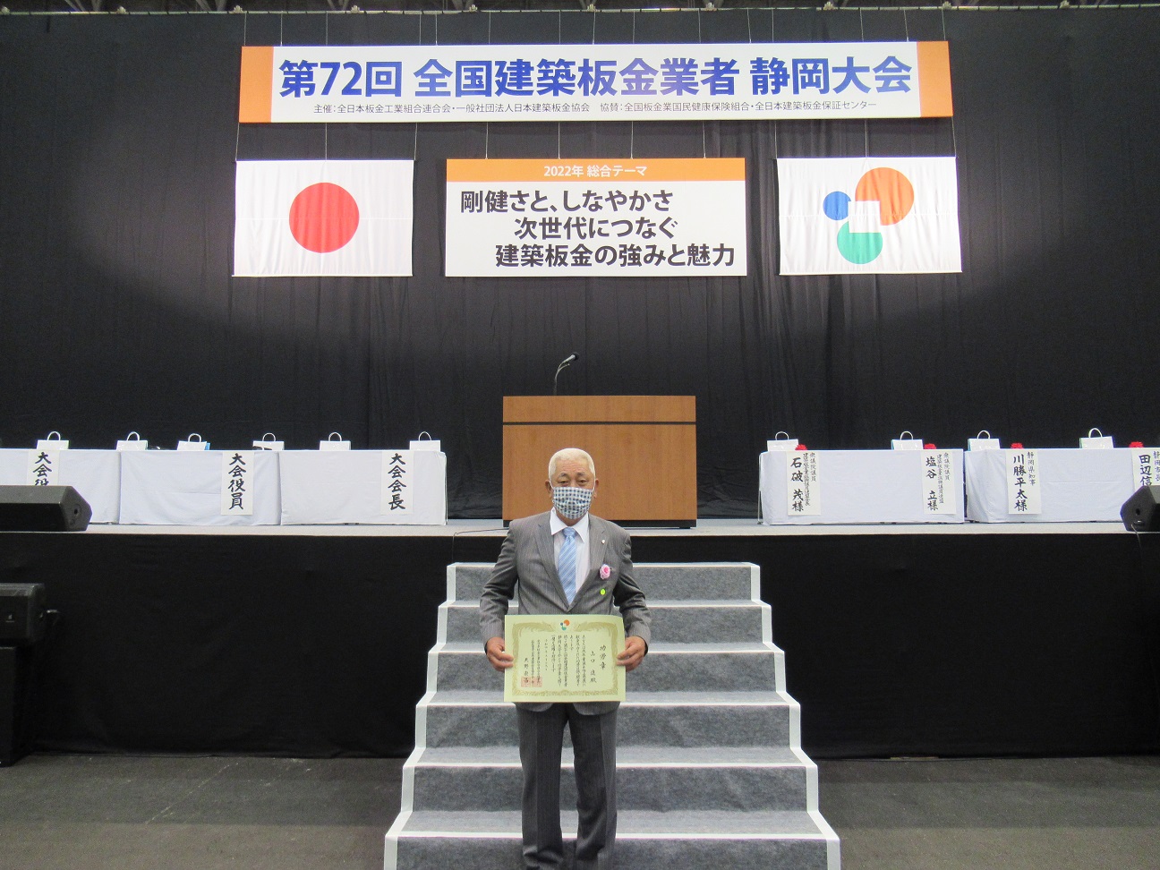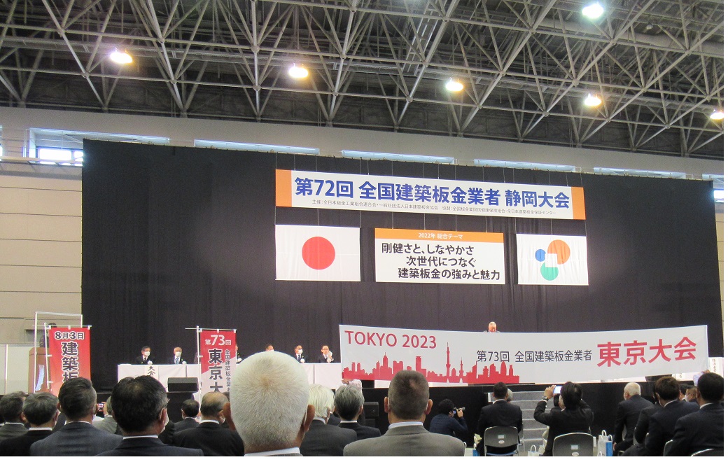 令和4年5月19日(木)「ツインメッセ静岡 北館」において、新型コロナウイルス感染拡大による2年の延期を経て、『第72回 全国建築板金業者静岡大会』が長崎県板23名、全国より約1,750名(内来賓、賛助会、出展業者300名)の参加者のもと盛会裏に開催されました。