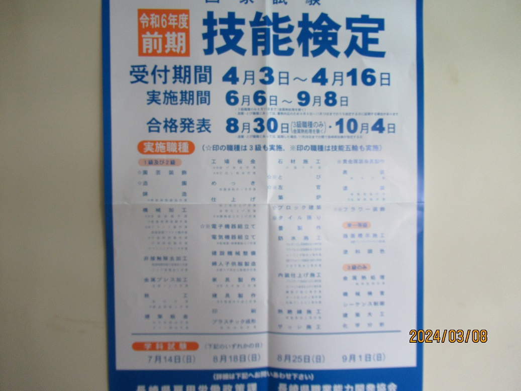 長崎県職業能力開発協会より令和6年度前期技能検定に建築板金(内外装板金)試験の案内がありましたのでお知らせいたします。受付期間は4/3~4/16(※添付資料あり)となっておりますので、間に合うように申込みをしてください。
