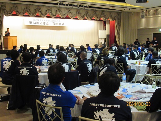 令和6年8月3日(土)都城グリーンホテルにおいて、九板協青年部『第13回研修会 宮崎大会』が開催されました。当日は猛暑の中、九州各地より各県青年部長をはじめ組合員90名(内長崎県板9名参加)、商社31名のもと13時より開会致しました。山下青年部長(長崎県板)の開会挨拶に始まり、野元青年部長(宮崎県板)の部長挨拶のあと来賓を代表して河野理事長(宮崎県板)の激励祝辞を頂きました。その後、第1部で村田豊氏(前全板青年部長)より「これからの板金組合と板金業界」と題して講演を頂きました。休憩後、第2部で出展企業の商品説明があり、最後は全員参加型のイベントもあり有意義な研修会でありました。