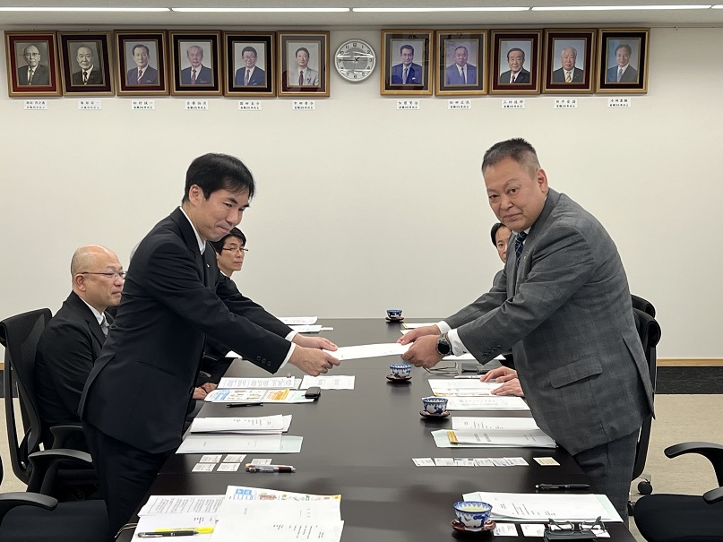 令和6年11月26日(火)長崎県庁舎議会棟において、顧問県議の中山議員、外間議員、千住議員にも同席して頂き、県板から折式田理事長、松下副理事長、石本副理事長、原口副理事長、黒田専務理事5名と県担当部局の実務者8名で意見交換会を行いました。この会の資料については過去に、平成15年と平成22年に当時の石本理事長はじめ3役の方々が開催した参考事例を基に資料を作成しました。