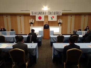 黒田専務理事の進行により、石本副理事長の開会の辞に始まり最初に物故者黙祷を行い、折式田理事長の挨拶、来賓紹介(中央会 小峰氏)後資格審査があり、組合員出席39名(委任出席22名)合計61名により本総会が成立する報告がありました。続いて議長選出は事務局一任により、伊藤謙哉氏(島原支部長)が議長となって議事を進行いたしました。議事については、第1号議案から第3号議案までの事業・会計・監査報告があり多数の拍手により承認され、引続き第4号議案、第5号議案の事業計画・予算案説明があり多数の拍手により無事承認されました。また、第6号議案各種事業報告、青年部報告も原案通り可決されました。第7号議案は任期満了に伴う役員改選があり各支部からの推薦による10名の理事者候補指名があり多数の拍手により無事承認され、新理事による別室での協議後、事務局より新役員が発表され代表して折式田理事長より再任の挨拶があり、最後は石本副理事長の閉会の辞にて滞りなく閉会しました。