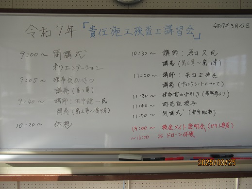 令和7年3月25日(火)諫早技能会館にて、責任施工検査士講習会(3年に1回)が県内6支部63名の参加で予定通りのプログラムで開催されました。