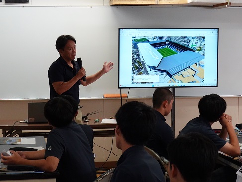 始めに理事長あいさつがありその後、建築板金の歴史と金属屋根を利用した国内の代表的な建築物、長崎県内の施工物件など10分間の映像を鑑賞してもらいました。次に、石本副理事長より施工物件の工法説明、黒田専務理事より新素材、施工法の説明がありました。生徒からの質疑応答ではAI技術の進化により人手による作業はどうなる等の質問がでたり、現在の金属屋根外壁のきほを知る事ができ、就職先のひとつに板金職も視野にいれてのコメントもありこの出前授業をやる事で建築板金の魅力をPRする良い機会であったと思います。