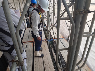 令和7年11月4日(火)13時30分より、令和7年度『専門工事業者等の安全衛生活動支援事業』の専門工事業者団体に当組合が指定されたことを受け、建設業労働災害防止協会長崎支部指導の下、世知原地区コミュニティセンター外壁改修工事(施工;佐世保支部会員(有)原口工業)の工事現場において本年第2回目の安全パトロールを実施しました。パトロール員は建災防の方2名と、組合推進委員の田中長崎支部長、伊藤島原支部長の計4名で巡回を実施しました。