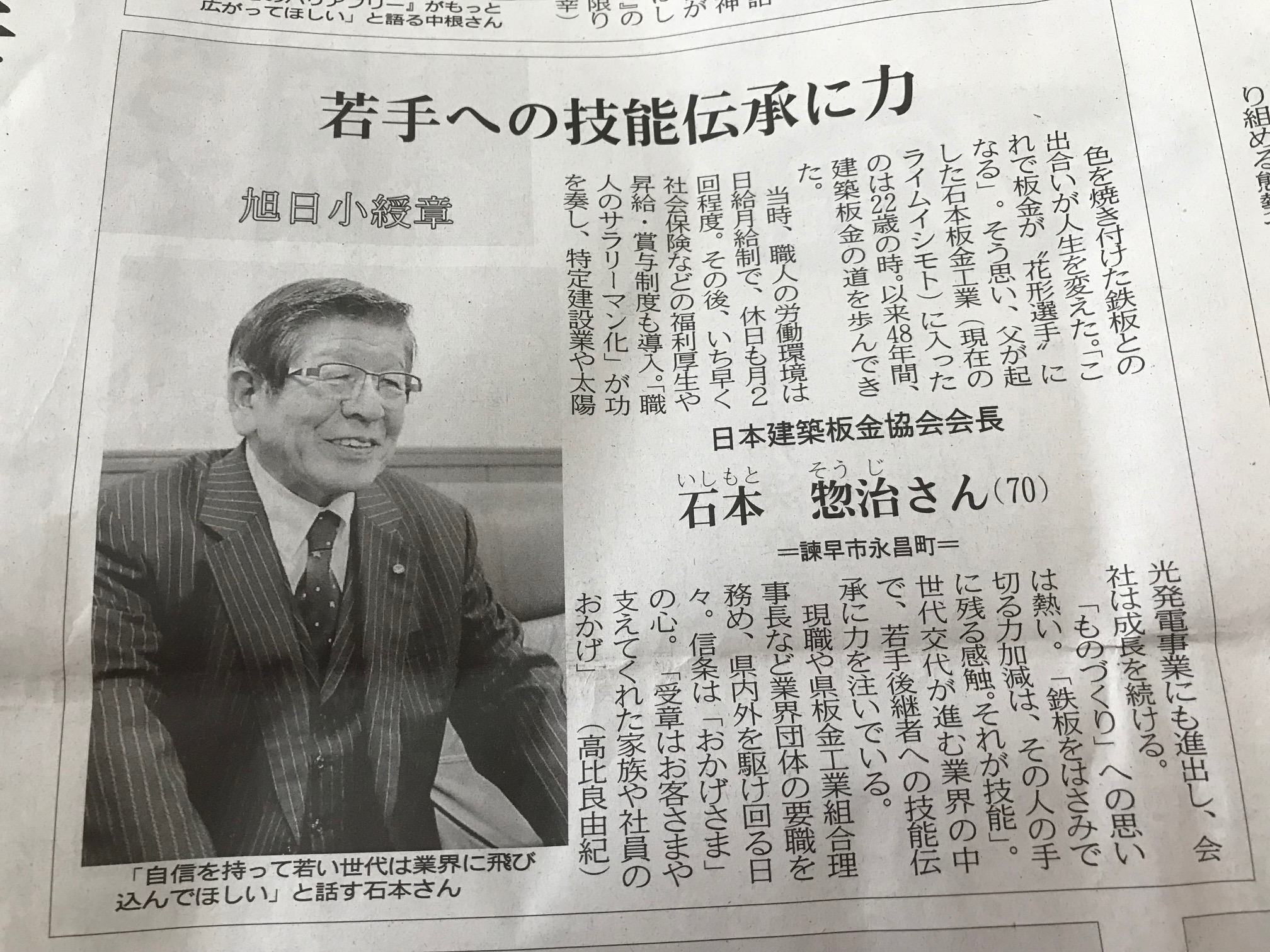 石本理事長は、全日本板金工業組合連合会の理事長・一般社団法人 日本建築板金協会会長を務めており、今回業界のトップとして専門工事業振興の功績により、この栄誉を受けました。